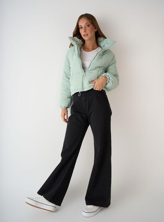 Parka corta marca Index, talla M. De color verde menta, con diseño acolchado horizontal. Cuenta con cuello alto, cierre frontal con tirador circular y puños elásticos. Confeccionada en material sintético de textura suave y acabado mate. Corte recto, largo a la cintura.